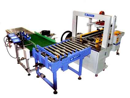 简介—— 配置:光电封箱机+全自动打包机+90度转向+皮带输送机+高解析喷码机+货物暂存滚筒